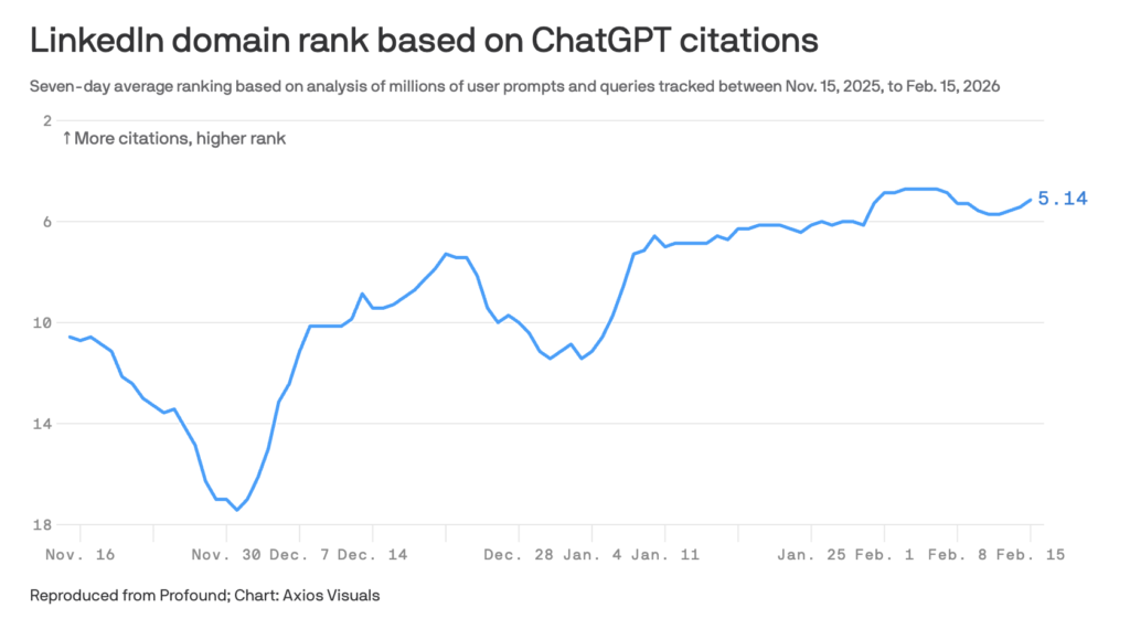 Since November 2025, LinkedIn’s citation frequency has doubled. For professional queries specifically, LinkedIn ranks number one across all AI search platforms, including Google AI Overviews. LinkedIn posts, long-form articles, and newsletters account for thirty-five percent of all LinkedIn citations within ChatGPT, while profiles get cited fourteen-point-five percent of the time.